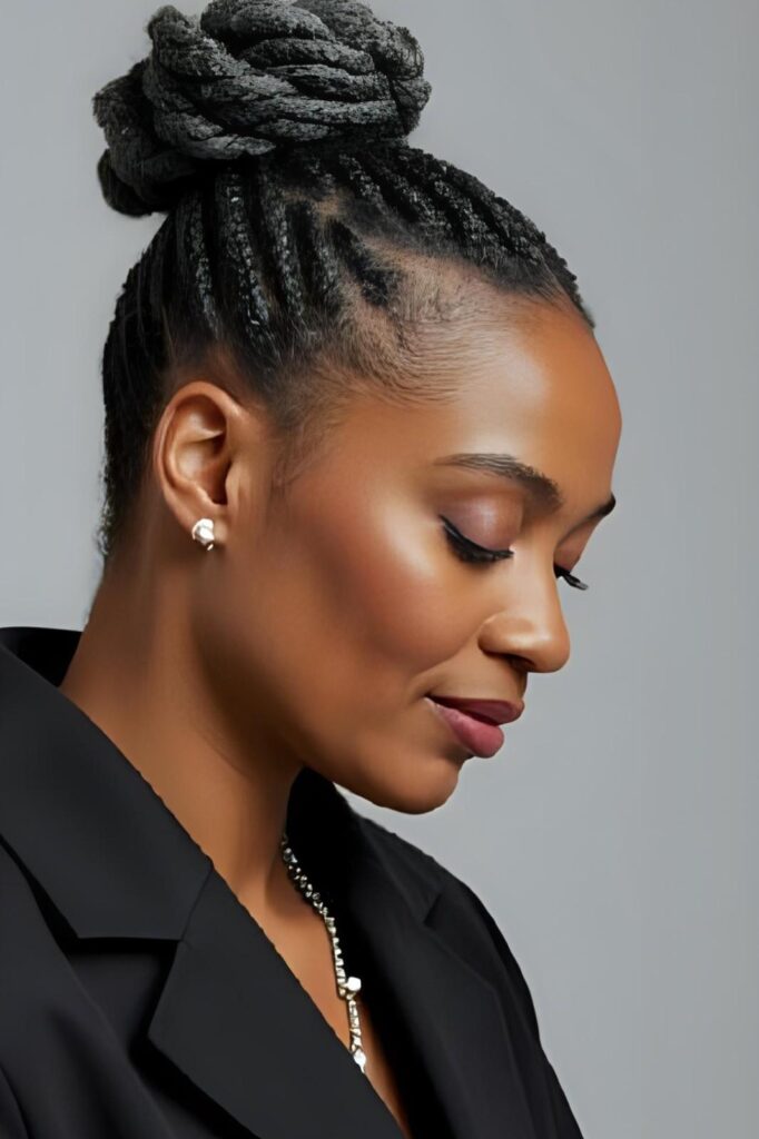 Cornrows swept into an updo, bringing both sophistication and functionality.